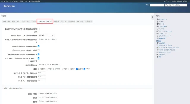 チケットのステータスと進捗率を連動させるためには、「管理」>「設定」>「チケットトラッキング」を選択してください。