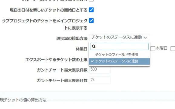 「進捗率の算出方法」を「チケットのステータスに連動」に変更します。