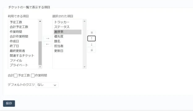 画面下部にある「チケットの一覧で表示する項目」の左側にある「進捗率」を選択し、右矢印アイコンをクリックして右側の「選択された項目」に移動します。