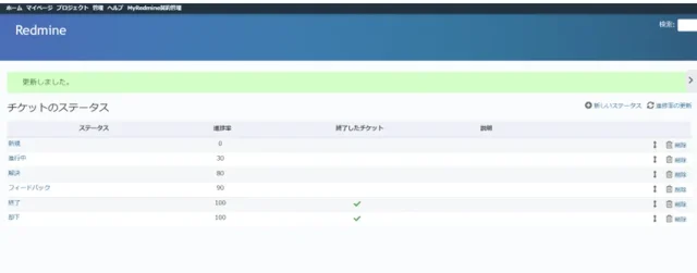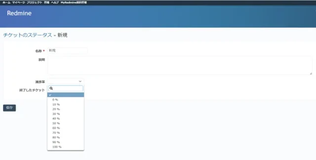 この状態で、各ステータス名のリンクをクリックすると、ステータスに「進捗率」が設定できるようになっています。