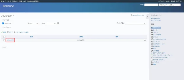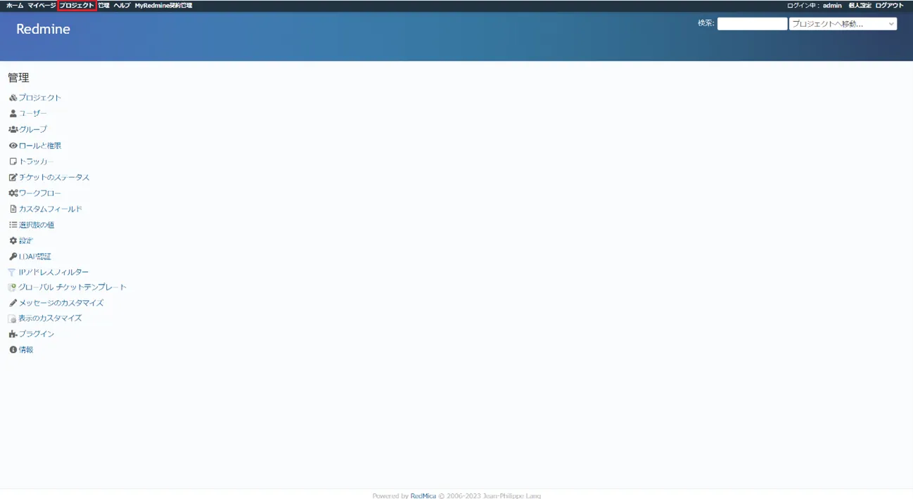 Redmineでプロジェクトを作成するには、「管理」>「プロジェクト」を選択します。