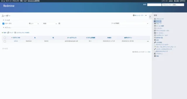 上記の記事に沿って、Redmineのインストールと初期設定までを行い、adminでログインできる状態にします。