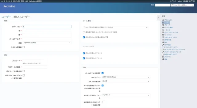 プロジェクトに参加するメンバーをRedmineに登録します。「管理」>「ユーザー」「新規ユーザー」を選択し、必要な情報を入力します。