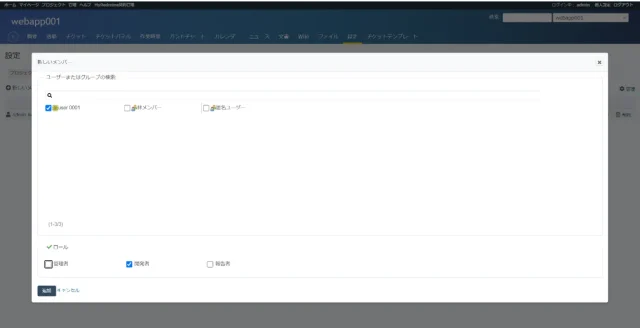 すると、以下の画面が表示され、プロジェクトに追加するユーザーと、そのユーザーに与えるロールを設定できます。