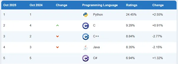 2025年10月時点で最も人気のあるプログラミング言語はPythonであり、そのあとにC、C++が続きます。Rubyはその中でも25位です。