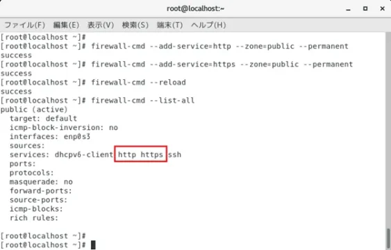 デフォルトでは「public」ゾーンが割り当てられていますが、http/httpsは通信が許可されていないため、このままではApacheをインストールしても通信を行うことができません。