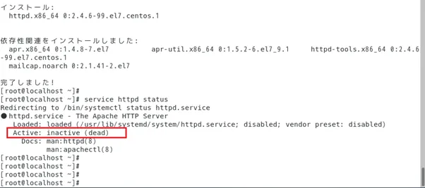 ステータスを確認すると「inactive(dead)」と表示されます。