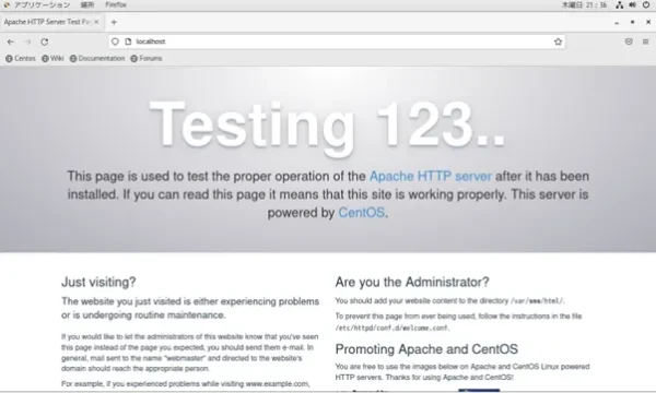 実際にブラウザを起動し以下のURLにアクセスすると、Apacheのテストページが表示されます。