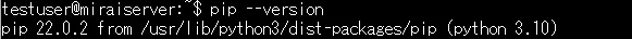 続いて、パッケージ管理ツール(pip)がインストールされていることを確認するため、以下のコマンドを実行します。