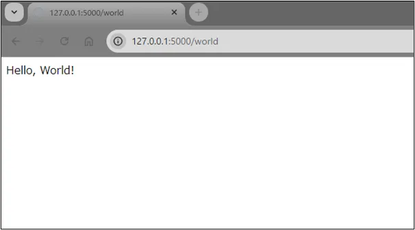 「http://127.0.0.1:5000/world」にアクセスすると、world()の関数が実行され、「Hello, World!」と表示されます。