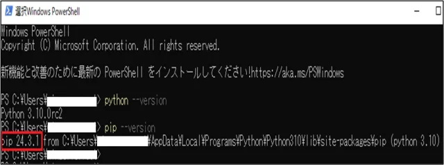 同様にpipも以下のコマンドを実行し、必要なバージョン以上であることを確認します。