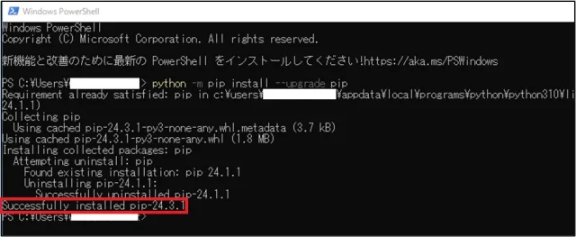 以下の例では、pip 24.1.1から、24.3.1にバージョンアップした結果です。