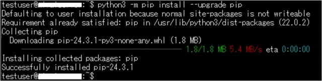 以下の例では、pip 22.0.2から、24.3.1にバージョンアップした結果です。