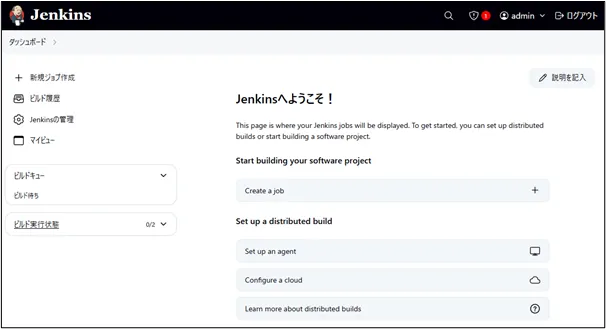 また、左側のメニューから「新規ジョブ作成」「Jenkinsの管理」などを選択できます。
