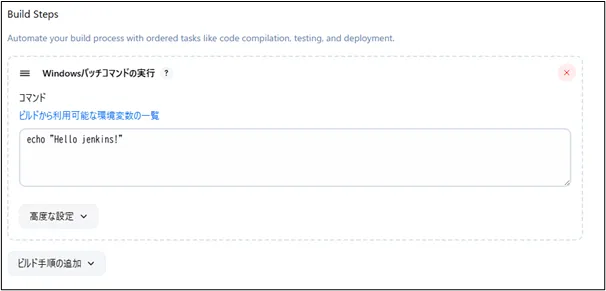 Build Stepsにて、Windows環境であれば「Windowsバッチコマンドの実行」、Linux環境であれば「シェルの実行」を選択します。