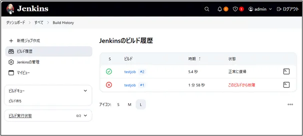 Jenkinsのダッシュボードでは、ジョブ(プロジェクト)一覧、ビルド履歴などが確認できます。