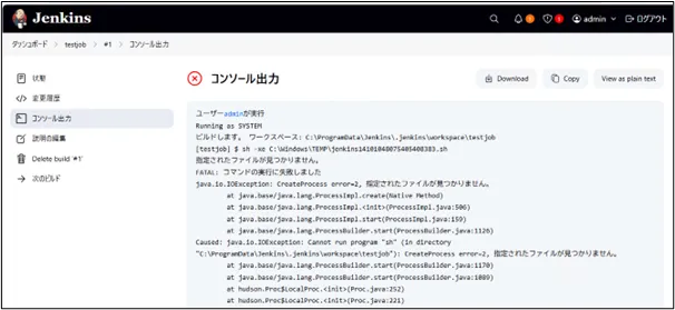 ビルド履歴をクリックすると詳細なコンソール出力(ログ)が確認できます。ここでエラーの原因を追跡しやすくなっています。