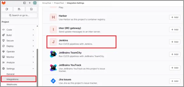 ①GitLabのプロジェクトを指定し「Settings」→「Integrations」を選択→表示された中から「Jenkins」を選択します。