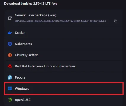 ①Jenkins公式サイトからWindows用インストーラー(.msi)をダウンロードし、画面に従ってインストールします。