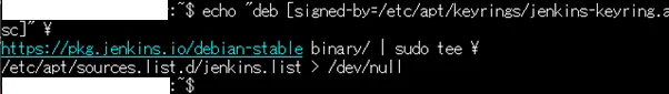 | echo “deb [signed-by=/etc/apt/keyrings/jenkins-keyring.asc]” \ https://pkg.jenkins.io/debian-stable binary/ | sudo tee \ /etc/apt/sources.list.d/jenkins.list > /dev/null |