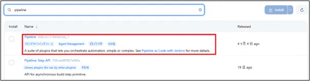 パイプラインを使うには「Pipeline」プラグインをインストールしておく必要があります。