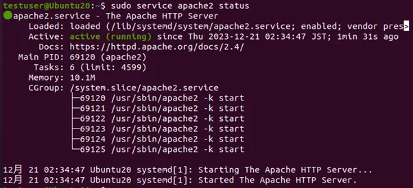 以下のコマンドでサービスの稼働状況を確認し、「Active」となっていれば、Apacheが起動しています。