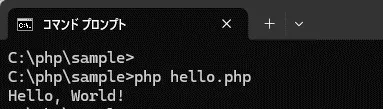以下の例は、Windowsのコマンドプロンプトでhello.phpを実行した結果です。