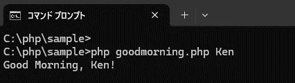 このスクリプトをphp goodmorning.php Kenというコマンドで実行すると、”Good Morning, Ken!”と出力されます。