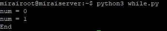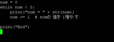 - 条件が偽になったのでwhile文を抜け、print(“End”)を実行。