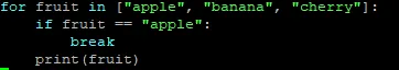 例えば、以下のコードでは、リストの要素が「apple」である場合、ループを終了します。