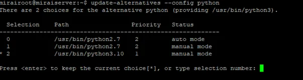 sudo update-alternatives –install /usr/bin/python3 python /usr/bin/python3.10 1