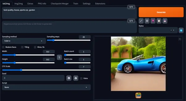 以下の例では、プロンプトに「best quality, house, sports car, garden」と入力した際に表示された画像です。