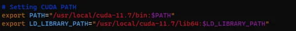 | $ vi ~/.bashrc ※以下を最後尾に追記 # Setting CUDA PATH export PATH=”/usr/local/cuda-11.7/bin:$PATH” export LD_LIBRARY_PATH=”/usr/local/cuda-11.7/lib64:$LD_LIBRARY_PATH” |