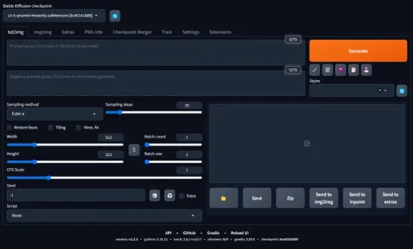 コンソールに記載されているURLにブラウザから接続すると、Stable Diffusion のUI画面が表示されます。