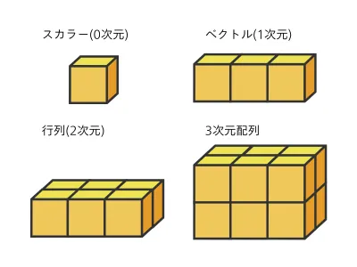 テンソルはスカラー(1次元)からベクトル(2次元)、行列(3次元以上)といった多次元のデータ形式に対応しており、大規模なデータセットも効率よく処理できます。