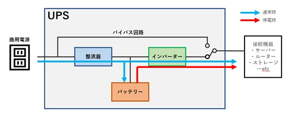 UPSは、インバーターや整流器などの電気回路によって構成される電力変換部と、バッテリーなどの蓄電部によって構成されています。