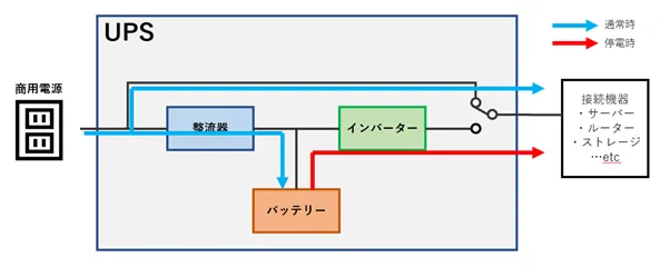 通常時は商用電源からインバーターを経由して電力を供給し、同時にバッテリーへの充電も行う方式です。
