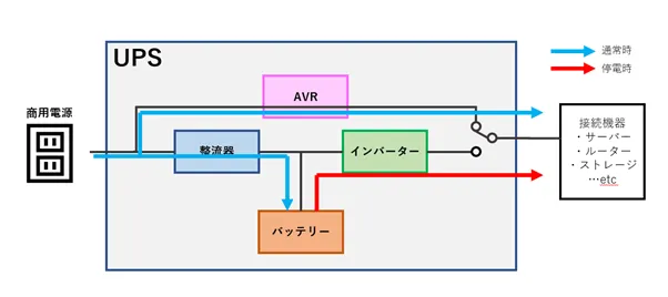 常時商用給電方式の経路上にAVR(電圧安定化機能)をつけ、停電時も安定した電圧供給を可能にした方式です。