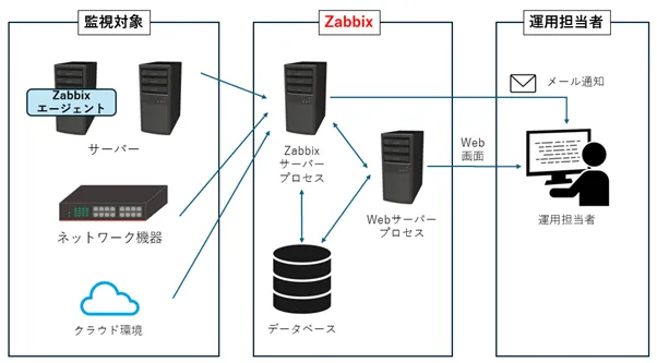 Zabbixは、主に以下のコンポーネントで構成されています。