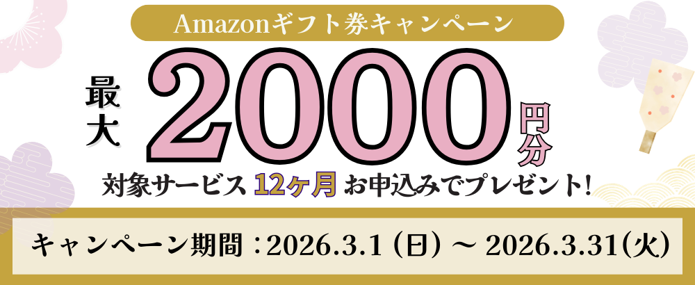 Amazonギフト券を最大2,000円分プレゼントいたしますので、ぜひこの機会に対象サービスへお申込みください。