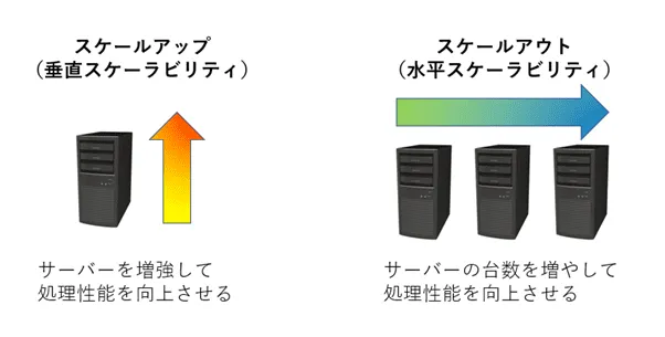 また、スケールアップは「垂直スケーラビリティ」、スケールアウトは「水平スケーラビリティ」とも呼ばれます。